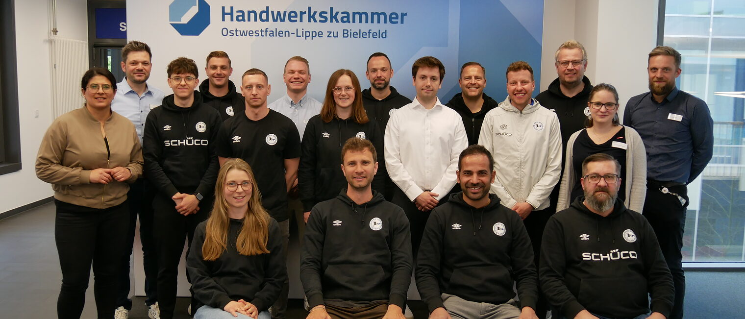 Welche Ausbildungsmöglichkeiten gibt es im Handwerk und wie kann ich mich danach weiterentwickeln? Darum und mehr ging es bei dem Besuch von Jugendtrainerinnen und -trainern der AKADEMINIA des DSC Arminia Bielefeld.